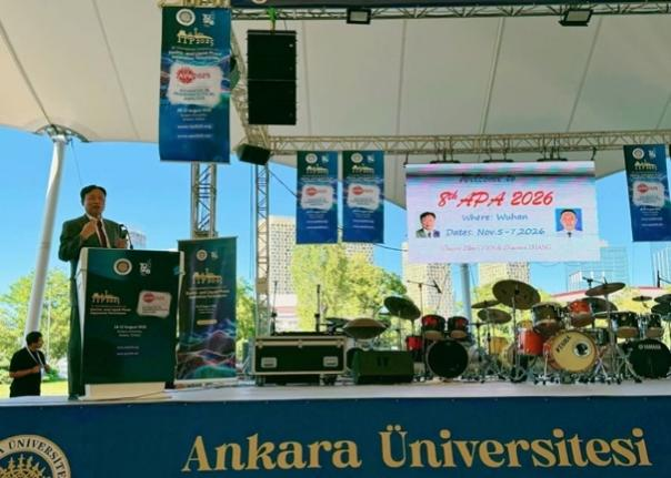 据悉,APA国际会议由陈子林教授于2017年在武汉大学发起并首次举办,此后,法国里尔大学、中国西安交通大学、法国洛林大学、中国清华大学、波兰格但斯克医科大学、土耳其安卡拉大学先后承办了第二至第七届会议,现在已发展成为国际上有重要影响力的药物分析国际会议,为我国向世界讲好中国药物分析故事提供了重要的国际交流平台。经大会学术委员会研究决定,第八届APA 会议将由我们承办,陈子林教授与张兆威教授任大会主席,陈子林教授在闭幕式上对APA 2026-武汉进行了宣讲(图2),并向参会代表发出参会邀请。