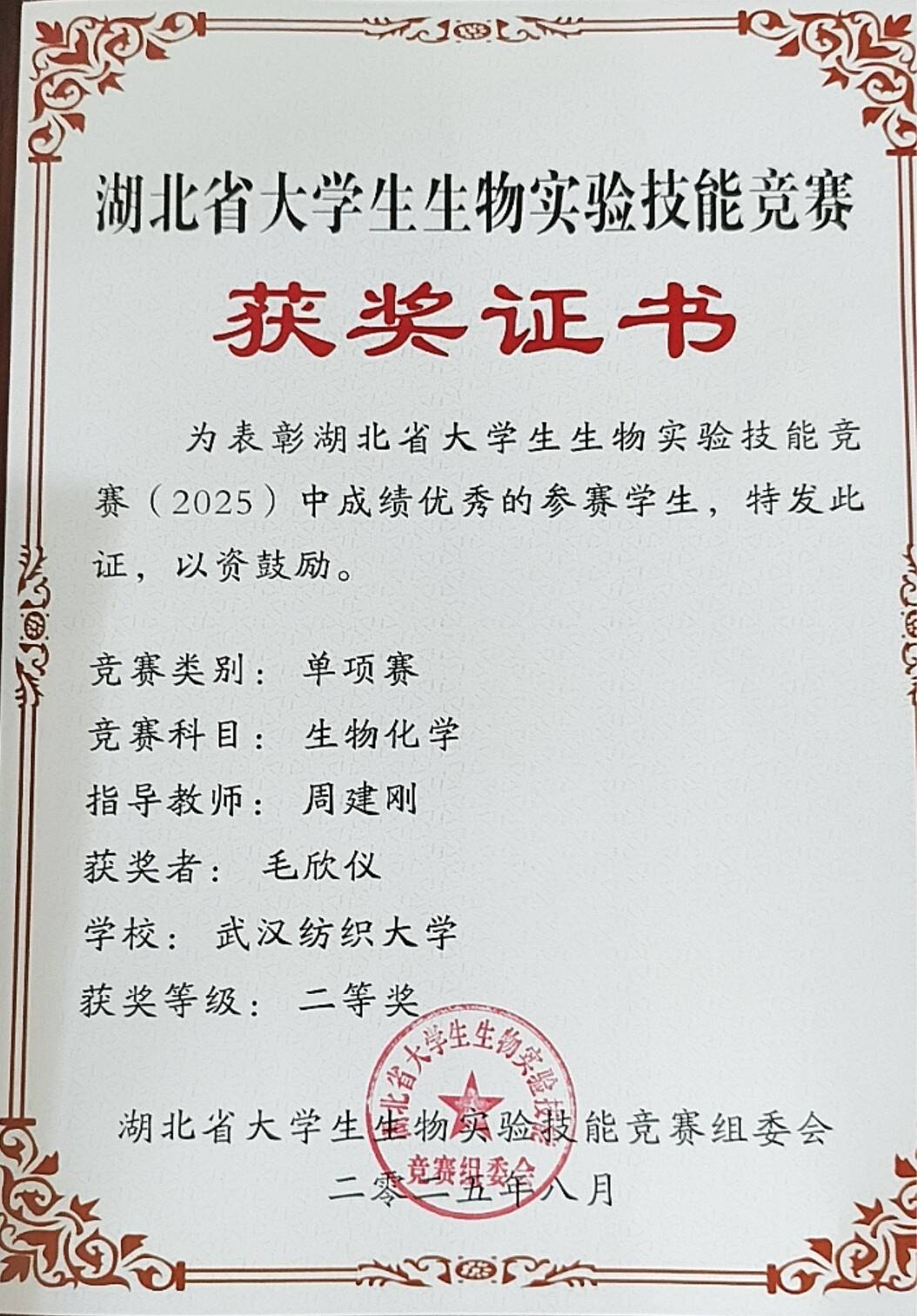 此次比赛需要参赛选手在规定时间内完成要求的各项操作,考验了选手们的实验操作和数据分析能力,经过角逐,我们生物工程专业2023级本科生毛欣仪在周建刚老师指导下斩获省级二等奖。