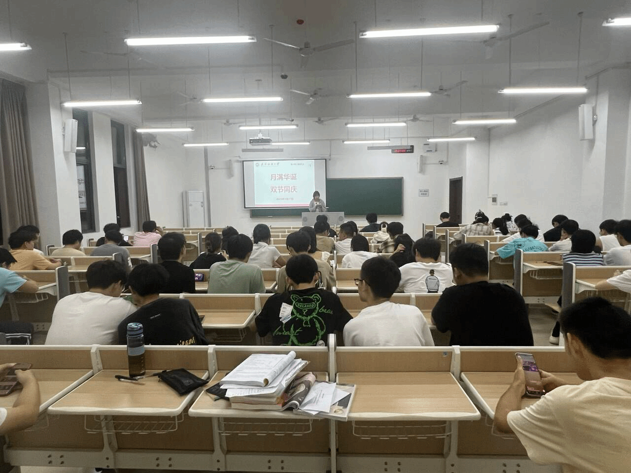 随后,班会围绕“月满华诞 双节同庆”主题开展了爱国主义教育。各班级结合新中国成立76周年,组织开展了主题班会,加强了学生的爱国主义教育,并通过假期安全教育提醒同学们注意假期出行、住宿及个人安全等问题。